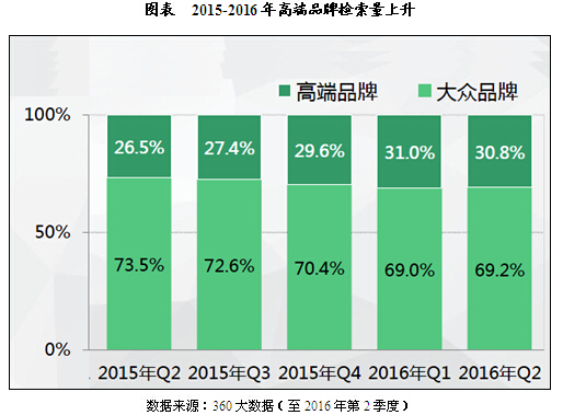 據市場調查公司了解,2015年2季度開始,高端品牌的檢索量占比逐漸擴大,消費者對高端品牌的消費需求更加旺盛。 2016年,高端品牌,品牌數量少集中度高,Top10品牌檢索量占比近60.0%,其中雅詩...
