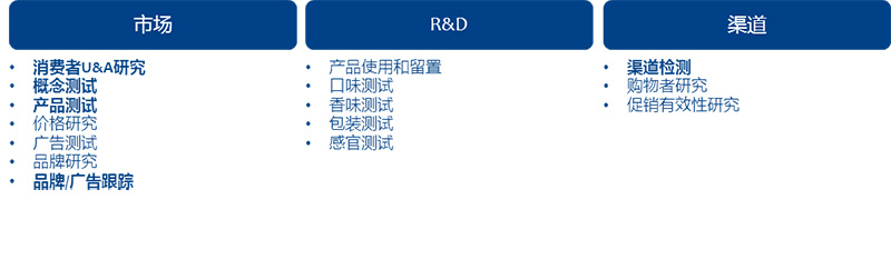 消費品(快消品)研究包含可行性研究、消費者U&A研究、概念測試、市場細分研究、產(chǎn)品測試、新產(chǎn)品創(chuàng)新開發(fā)、品牌研究及品牌定位、品牌評估與傳播、廣告及活動效果評估、服務(wù)滿意度研究、渠道監(jiān)測等等。華夏經(jīng)緯研究團隊提供新產(chǎn)品從機會識別到上市、量產(chǎn)及升級的全流程服務(wù)。