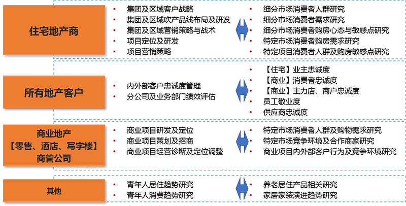 針對地產(chǎn)企業(yè)的不同業(yè)務部門/模塊,華夏經(jīng)緯提供多樣化、全覆蓋的市場研究服務,全面助力專項業(yè)務能力提升。
