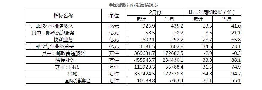 2月份,全行業(yè)業(yè)務(wù)收入完成435.2億元,同比增長41%;業(yè)務(wù)總量完成602.6億元,同比增長73.1%。