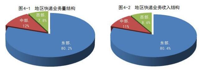 與去年同期相比,東部地區(qū)快遞業(yè)務(wù)量比重上升了0.6個百分點,快遞業(yè)務(wù)收入比重上升了0.4個百分點;