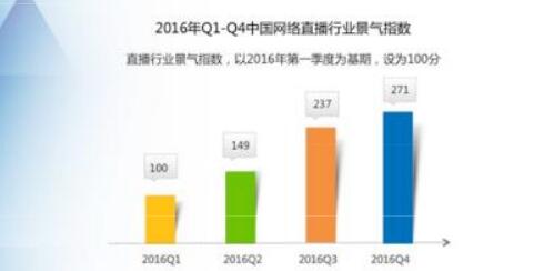 2016年我國的網(wǎng)絡(luò)直播行業(yè)實(shí)現(xiàn)了全年持續(xù)增長,以一季度100為基數(shù),第四季度中國網(wǎng)絡(luò)直播行業(yè)景氣指數(shù)為271,環(huán)比增長14.34%,在經(jīng)歷了前三季度的爆發(fā)式增長之后,中國網(wǎng)絡(luò)直播行業(yè)步入平穩(wěn)增長期。