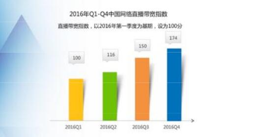具體來看,延續(xù)前三季度網(wǎng)絡(luò)直播帶寬指數(shù)的持續(xù)增勢(shì),2016年第四季度中國網(wǎng)絡(luò)直播帶寬指數(shù)為174,環(huán)比增長16%,與二季度的環(huán)比增速持平。