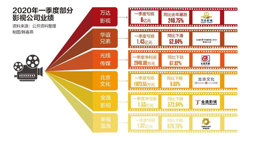 影院停業(yè)、電影撤檔的背后,上市影視公司業(yè)績一片慘淡。萬達(dá)電影一季度營收同比下跌70.12%,虧損近6億元,同比去年暴跌249.75%。中國電影一季度營收同比下降88.39%,虧損2.27億元,同比去年暴跌163.95%。此外,華誼兄弟、橫店影視、金逸影視等一季度均處于虧損狀態(tài)。