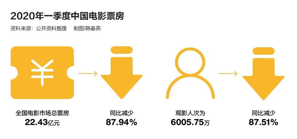 藝恩數(shù)據(jù)顯示,2020年一季度,全國電影市場總票房22.43億元,同比減少87.94%;觀影人次為6005.75萬,同比減少87.51%。電影票房和觀影人次的暴跌,使得包括影視制作公司、宣傳發(fā)行公司、院線公司在內(nèi)的整個(gè)電影行業(yè)都不景氣。